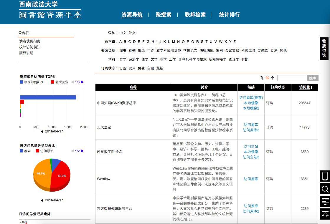聯(lián)創(chuàng )圖書(shū)館智慧平臺電子資源檢索訪(fǎng)問(wèn)和統計分析系統還是一套針對圖書(shū)館及相關(guān)文獻情報機構開(kāi)發(fā)的,能自適應各種終端設備的信息化系統,是涵蓋圖書(shū)館門(mén)戶(hù)、數字資源管理、一站式檢索與統計、讀者評價(jià)與咨詢(xún)、電子資源遠程訪(fǎng)問(wèn)等多個(gè)方面的一體化綜合解決方案。提出了門(mén)戶(hù)建設的新思路,探索出一站式檢索新模式,找到了提升資源遠程訪(fǎng)問(wèn)能力的新方法,解決了電子資源庫迅速增加帶來(lái)的管理難、利用低的新問(wèn)題。